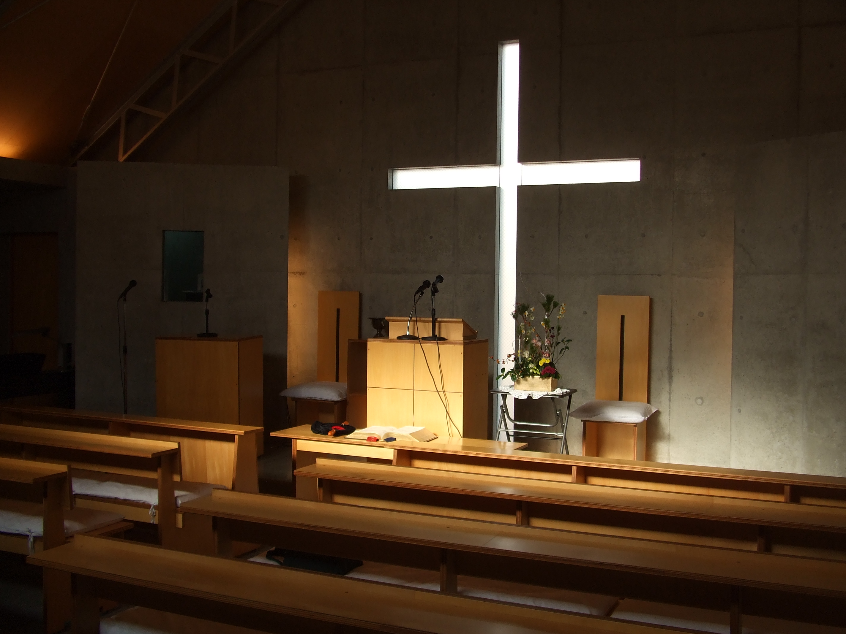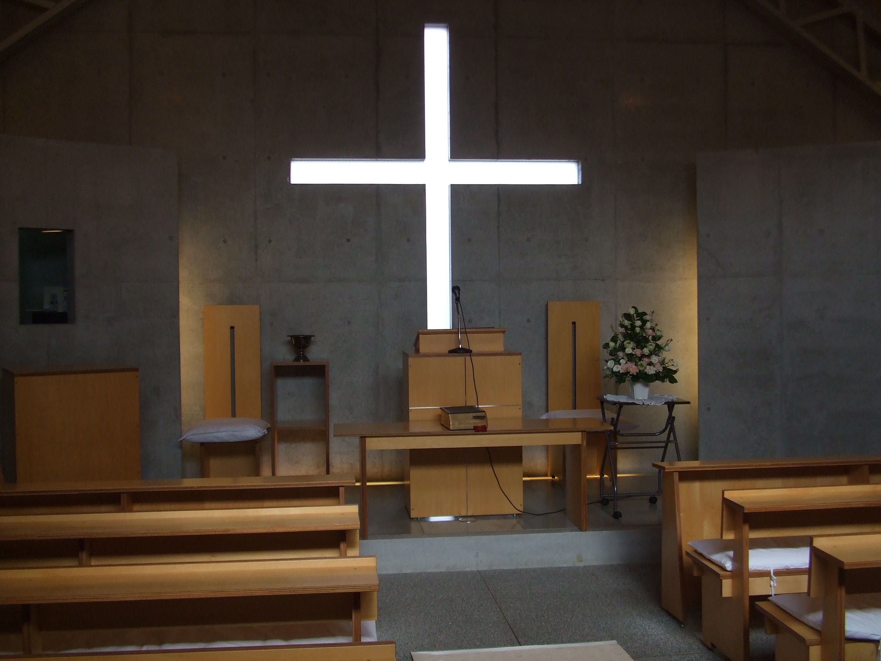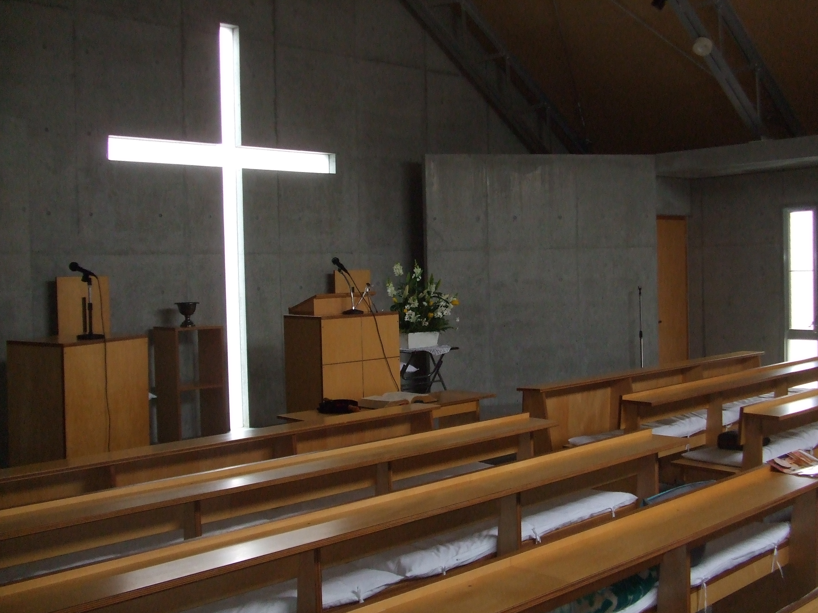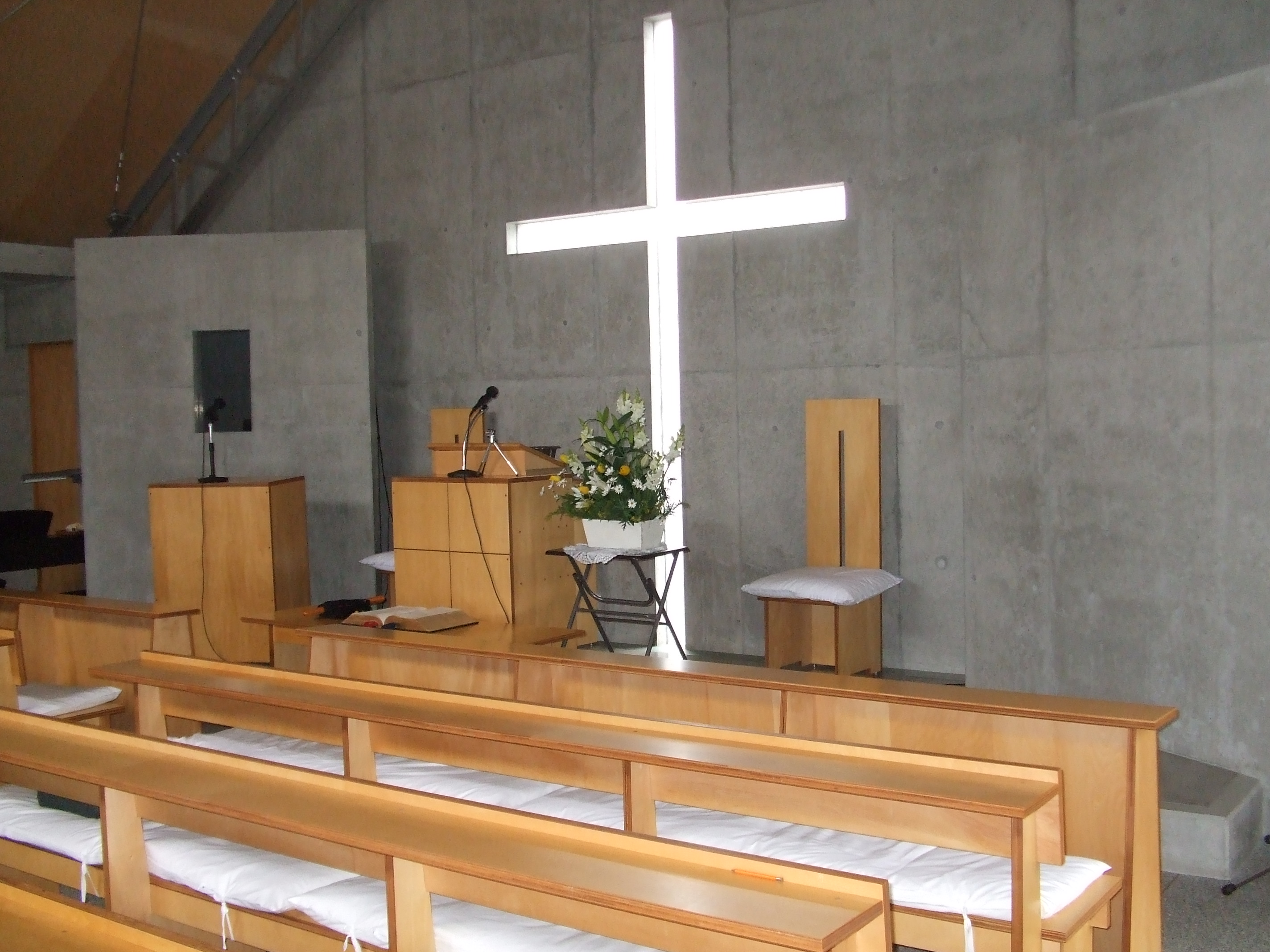 礼拝堂の様子です。コンクリートの打ちっ放しです。礼拝堂は2階にあります。エレベーターか外階段をお使い下さい。礼拝は午前10時15分からです。11時30分過ぎに終了します。 隣の家が立て替えの時の撮影しました。壁が雨のせいで汚れていますが、少しきれいにしました。 その他、少しスライドを並べました。
