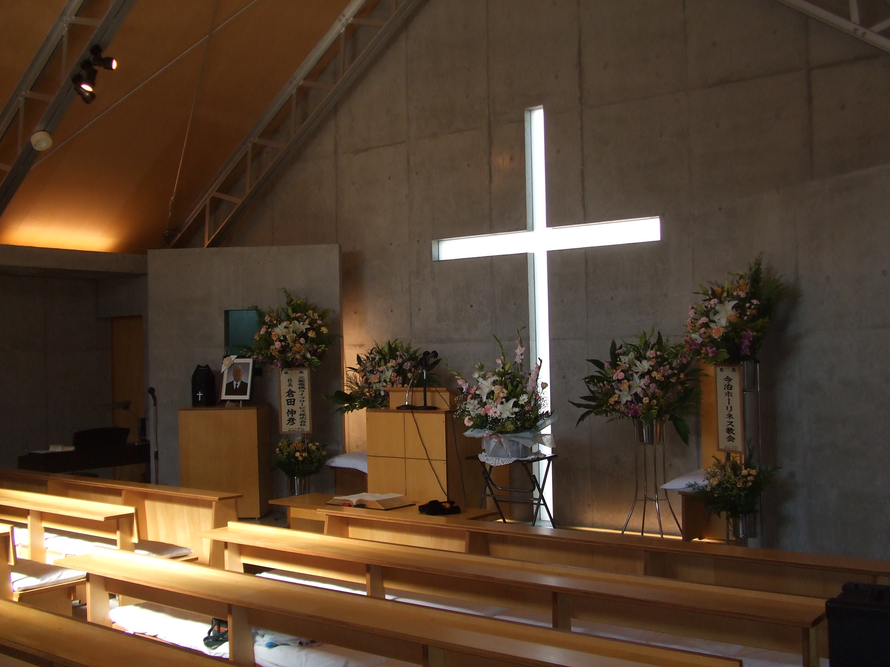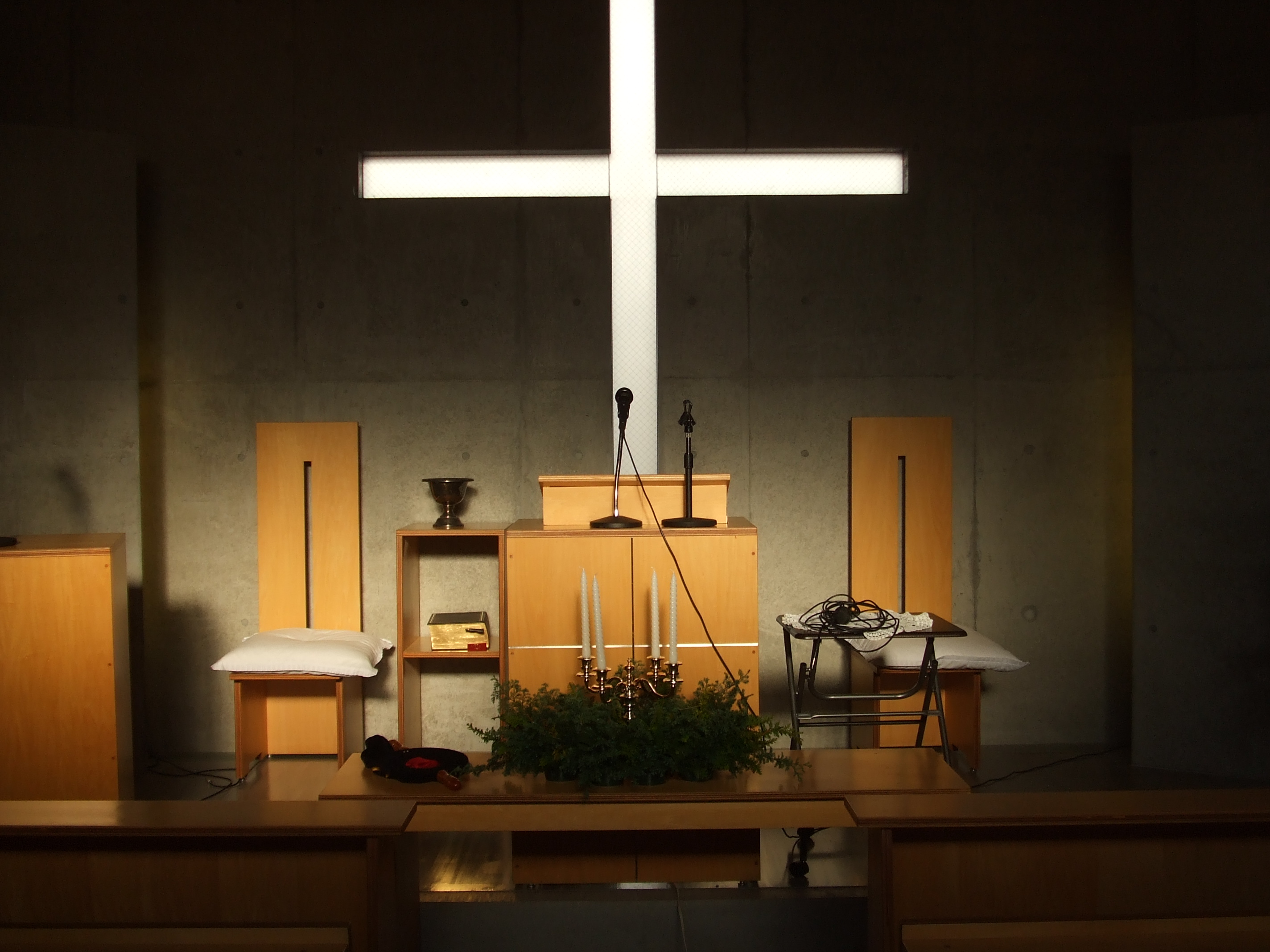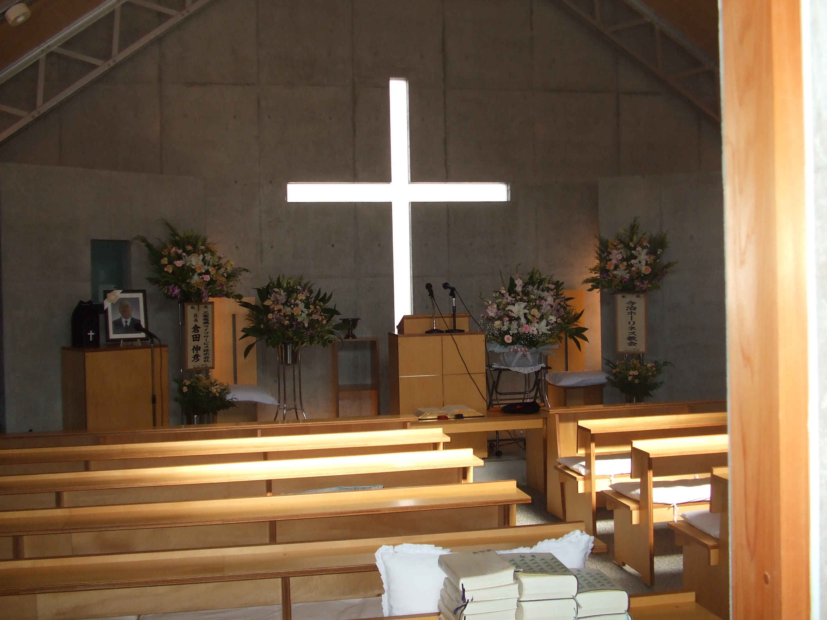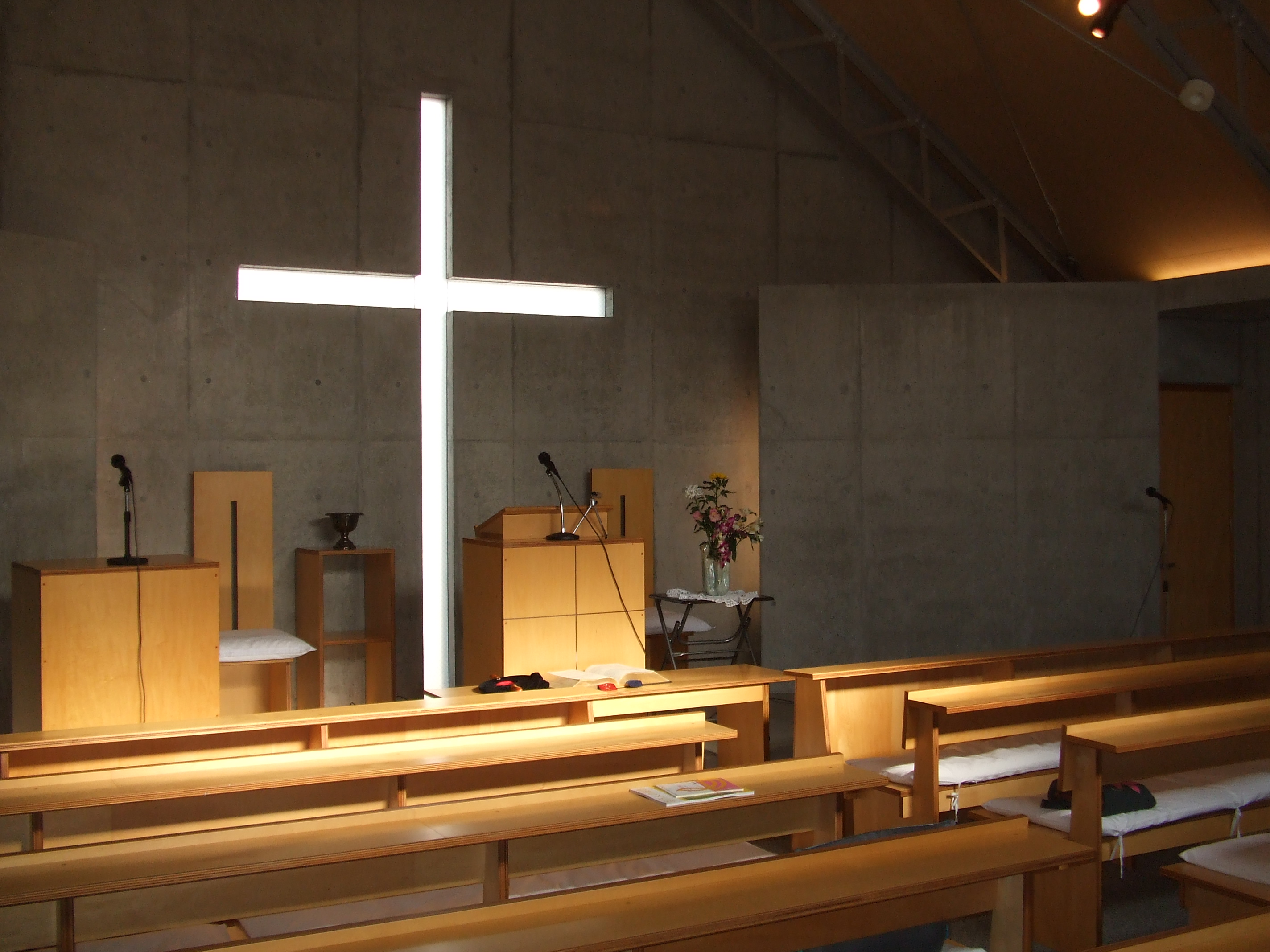 礼拝堂の様子です。コンクリートの打ちっ放しです。礼拝堂は2階にあります。エレベーターか外階段をお使い下さい。礼拝は午前10時15分からです。11時30分過ぎに終了します。 隣の家が立て替えの時の撮影しました。壁が雨のせいで汚れていますが、少しきれいにしました。 その他、少しスライドを並べました。