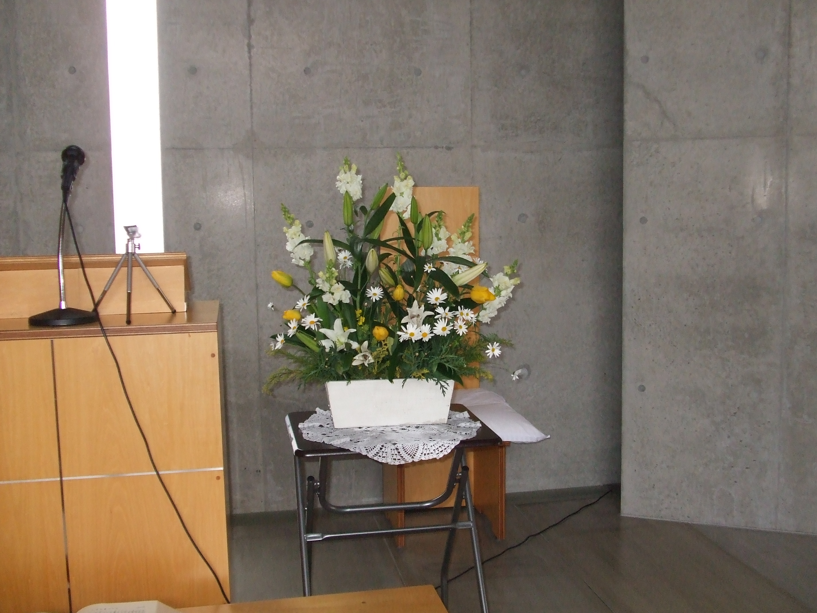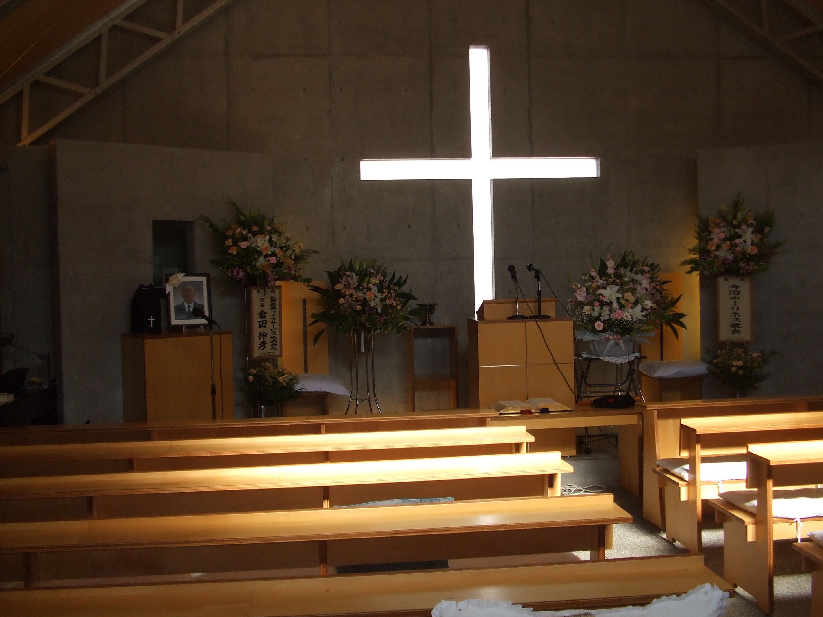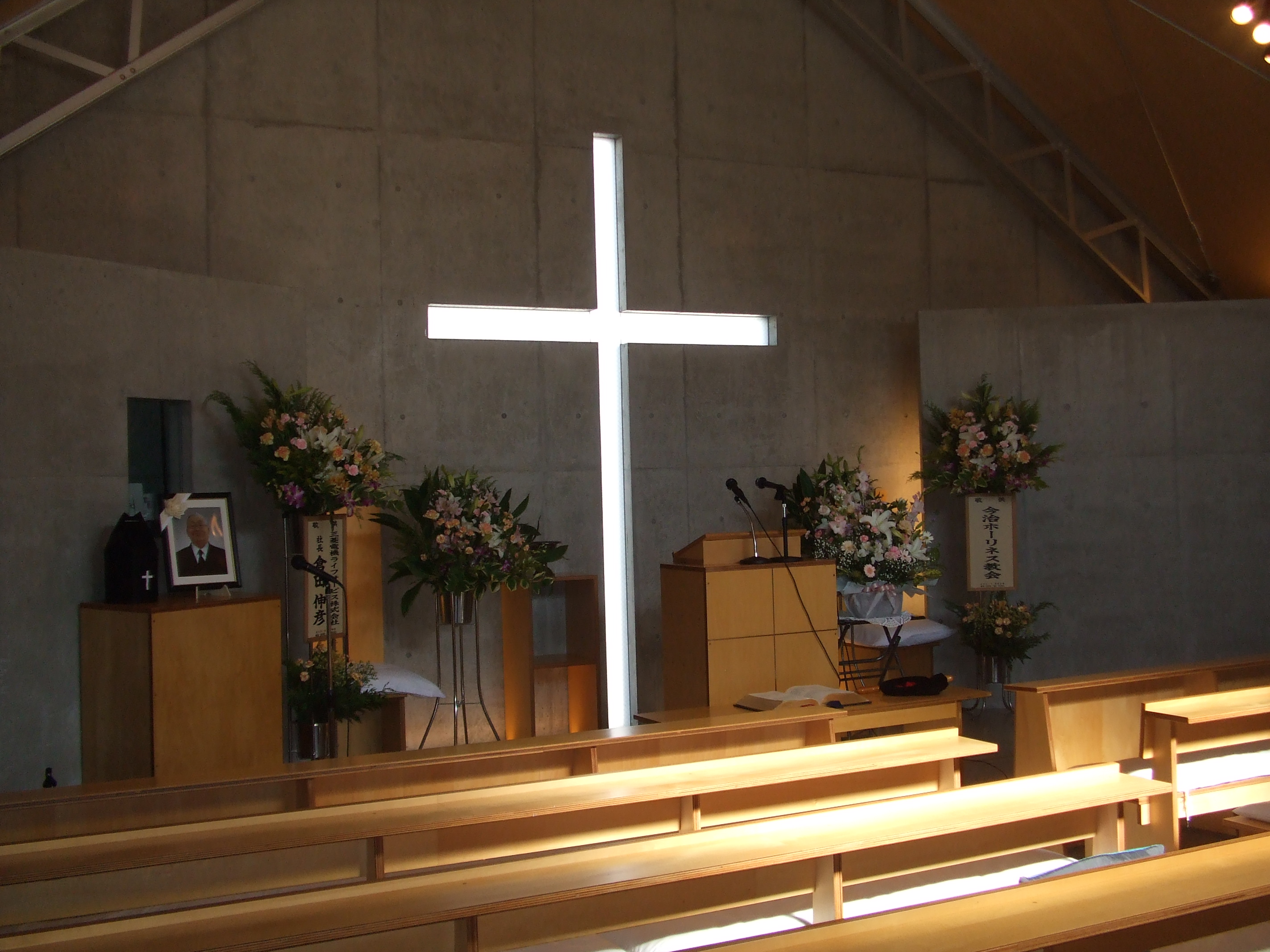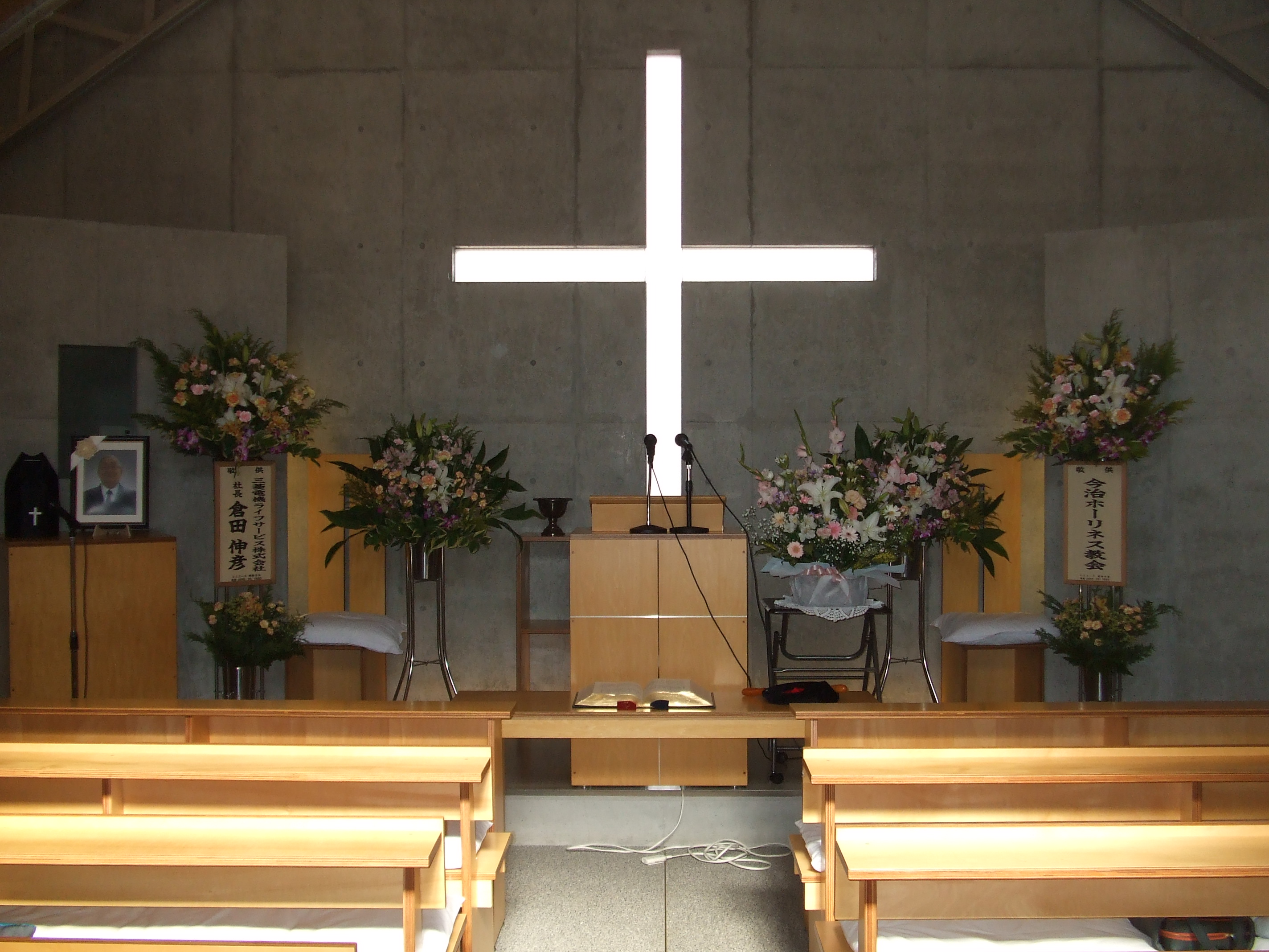 礼拝堂の様子です。コンクリートの打ちっ放しです。礼拝堂は2階にあります。エレベーターか外階段をお使い下さい。礼拝は午前10時15分からです。11時30分過ぎに終了します。 隣の家が立て替えの時の撮影しました。壁が雨のせいで汚れていますが、少しきれいにしました。 その他、少しスライドを並べました。